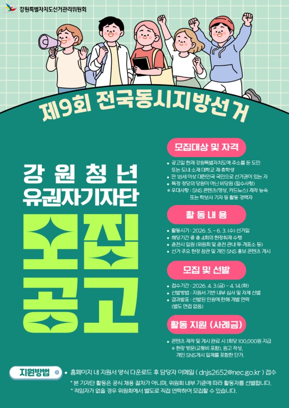 강원특별자치도선거관리위원회는 춘천 권역의 공정한 선거 현장을 생생하게 전달할 '강원 청년 유권자기자단'을 아래와 같이 모집합니다. 강원 청년들의 많은 관심과 참여 바랍니다.